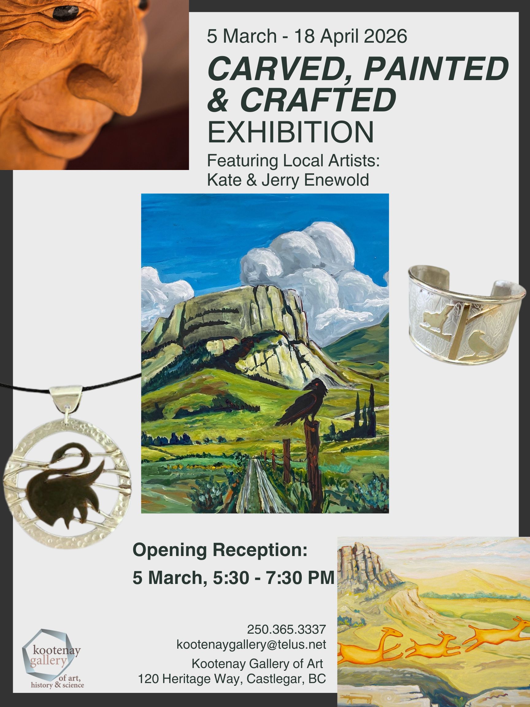 The Kootenay Gallery of Art is pleased to present Carved, Painted and Crafted, a captivating exhibition by local artists Kate and Jerry Enewold.