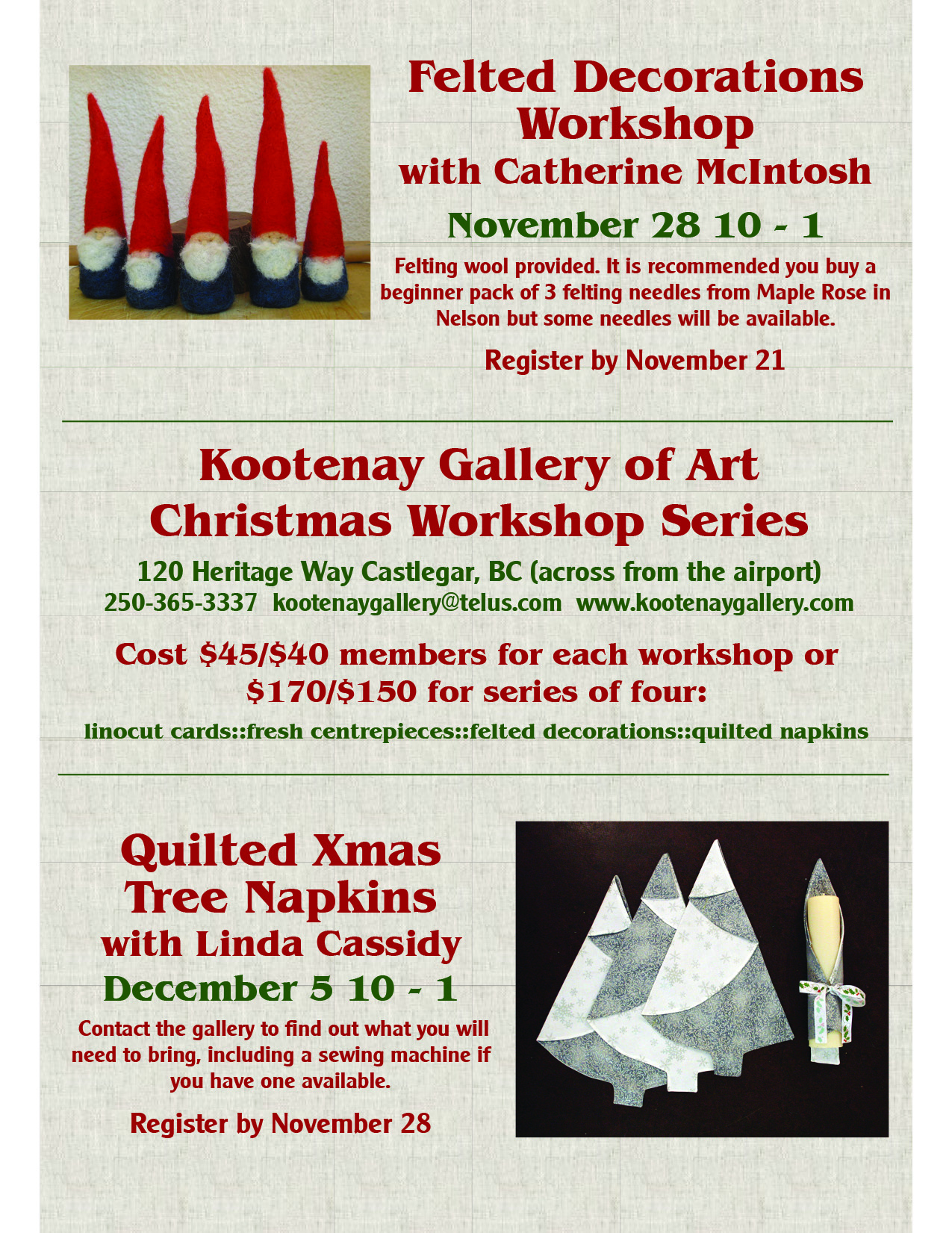 Please contact the gallery SOON to register for the workshop. If we do not have enough interest for the Quilted Napkins, we will cancel the workshop.
